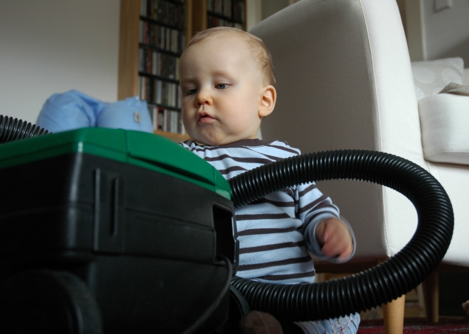 Joris mit seinem Lieblingsspielzeug, dem Staubsauger. Nichts ist so interessant wie das grüne Monster mit dem schwarzen Rüssel. Da kann einfach nichts mithalten.